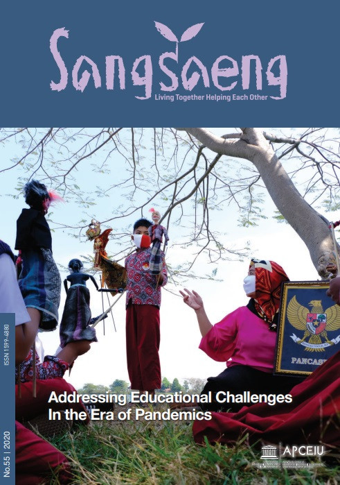 Addressing Educational Challenges In the Era of Pandemics (SangSaeng no.55, 2020) Year of publication: 2023 Corporate author: APCEIU With the prolonged COVID-19 pandemic, the global crisis has further aggravated various multifaceted challenges to humanity. We are forced to prepare for another paradigm shift or, in other words, a “New Normal.” With this in mind, the 55th edition of SangSaeng focuses on “Addressing Educational Challenges in the Era of Pandemics.” Contents03 Editor’s Note04 Special ColumnTowards Sustainability: Implications of Pandemic and How to Create the Future We All Want / Jae C. Choe 08 FOCUS: Addressing Educational Challenges in the Era of Pandemics08 Rethinking Education in the Shadow of the Pandemic / Edward Vickers12 Reimagining Education System to Reduce Social Inequalities / Paul R. Carr16 Reshaping Kenya for Beyond COVID / Jane Wanjiru Nyaga19 Rethinking Human Rights Education in the Pandemic / Abraham Magendzo K.22 Prioritizing GCED in Recovery of Pandemic: Challenges and Opportunities / Romina Kasman 26 Best Practices26 Loxo Yakaar: Hands of Hope / Karima Grant and Chakera McIntosh29 Care for Tomorrow Starts Today / Tina Trdin 32 Special ReportReport on the Round Table: “Next Normal” We Make / IGCED, APCEIU 36 Story TimeHow Do You Paint? / Recka Olasiman 38 Peace in My MemoryGive Me Peace on Earth / Libby Giles 41 Understanding the Asia-Pacific RegionWater Heritage in Southeast Asia / Karen Chin Ai Ying 45 GCED Youth NetworkMeaningful Spaces to Exchange and Learn Together / GCED Youth Network Core Group 48 LetterPromoting GCED in Sri Lanka / Deshamanya A.L.S. Abeywickrama 50 APCEIU in Action
