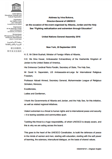 Address by Irina Bokova, Director-General of UNESCO, on the occasion of the event organized by Albania, Jordan and the Holy See: Fighting radicalization and extremism through Education; United Nations General Assembly 2016; New York, 20 September 2016 Year of publication: 2016 Corporate author: UNESCO. Director-General, 2009-2017 (Bokova, I.G.) This address was presented by Irina Bokova, Director-General of UNESCO, on the occasion of the event organized by Albania, Jordan and the Holy See.