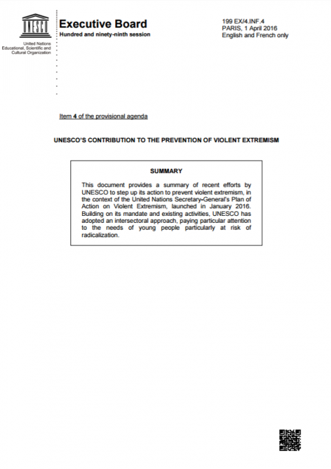 UNESCO's role in promoting education as a tool to prevent violent extremism Year of publication: 2015 Corporate author: UNESCO This item has been included in the provisional agenda of the 197th session of the Executive Board at the request of the United States of America and co-sponsored by Bosnia and Herzegovina, Bulgaria, Costa Rica, Côte d’Ivoire, Djibouti, Finland, France, Germany, Jordan, Kenya, Latvia, Nigeria, Norway, Pakistan, Philippines, Republic of Korea, Rwanda, Senegal, Slovenia, Suriname, Switzerland and Turkey