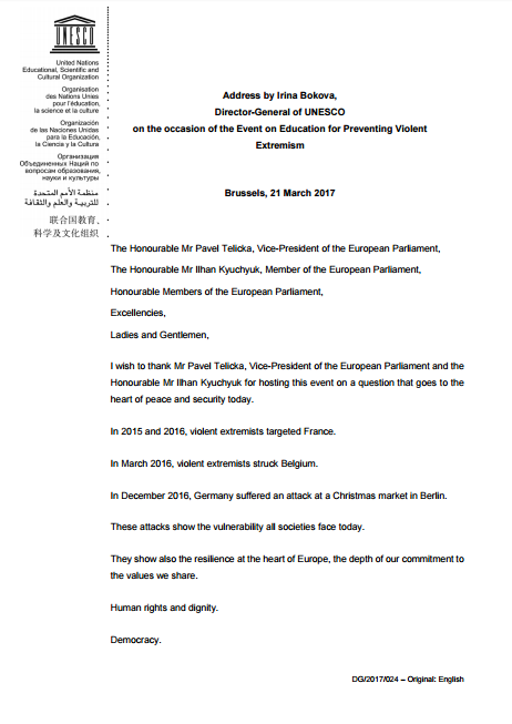 Address by Irina Bokova, Director-General of UNESCO on the occasion of the Event on Education for Preventing Violent Extremism; Brussels, 21 March 2017 Year of publication: 2017 Corporate author: UNESCO. Director-General, 2009-2017 (Bokova, I.G.) This address was delivered by Irina Bokova, Director-General of UNESCO on the occasion of the Event on Education for Preventing Violent Extremism.