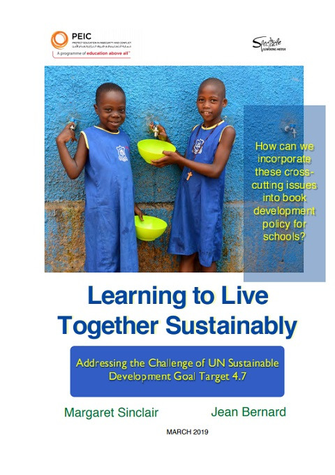Learning to Live Together Sustainably: Addressing the Challenge of UN Sustainable Development Goal Target 4.7 Year of publication: 2019 Author: Margaret Sinclair | Jean Bernard Corporate author: Protect Education in Conflict and Insecurity (PEIC) | Spectacle Learning Media The practical advice and guidelines in this book help support learning to live together, conflict transformation and peace at the individual, group and community levels. The framework for developing widely accessible, high quality learning materials supports the UN Sustainable Development Goals and is relevant to formal and non-formal education activities and projects. This document also raises important issues about the professional responsibilities of policy-makers at global and national level, who determine what content is addressed in the classroom. In particular, it addresses the need for education materials that support cross-cutting issues such as learning to live together, global citizenship education, and education for sustainable development.