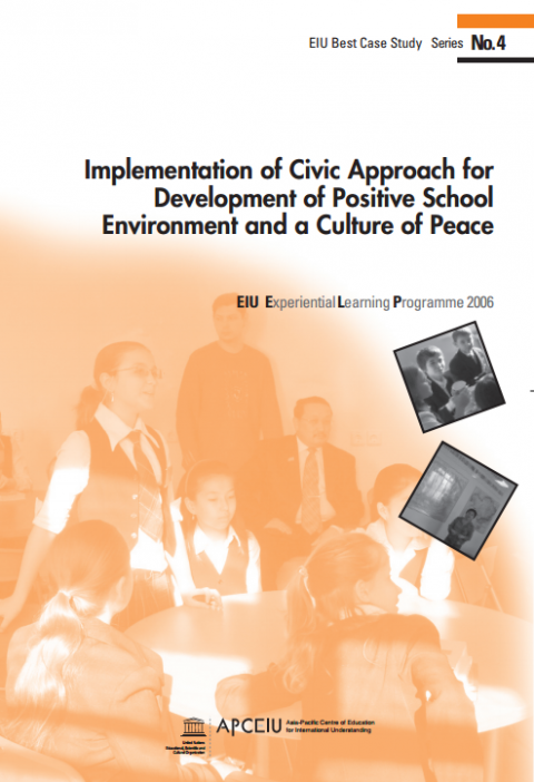 EIU Best Practices Series No. 4: Implementation of Civic Approach for Development of Positive School Environment and a Culture of Peace Year of publication: 2006 Corporate author: APCEIU This monograph is one of APCEIU's EIU Best Practices Series, which aims to encourage educators, scholars, and activists to implement and share local initiatives on EIU. The Series No.4 is an experimental research conducted by the Information and Research Center to promote culture of peace and teaching and learning outcomes that support positive development of school environment. Three pilot schools in Kazakhstan were analyzed upon implementation of teacher training workshops, instructional materials, and programs in civic and human rights education.
