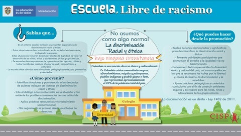 School Coexistence Toolkit: Preventing Racism Corporate author: Ministry of Education of Colombia Xenophobia and racism are forms of intolerance and discrimination and, in both cases, are violations of human rights. These infographics address this social phenomenon and relational situation, extending the message and intention of the protocol on the same subject, which is why it constitutes a roadmap to respond from a comprehensive perspective to situations in which discrimination occurs due to ethnic and racial aspects or that promote exclusionary or stigmatizing acts against girls, boys, and adolescents because of their ethnic or racial affiliation.