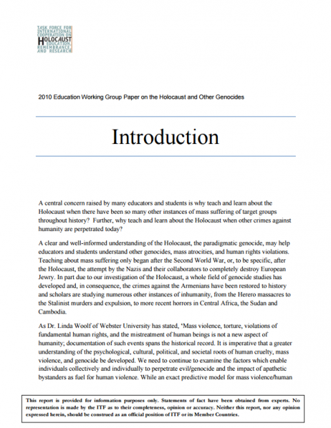 Holocaust and Other Genocides In this series of documents, the IHRA's Education Working Group offers ideas and recommendations to educators who wish to teach about the Holocaust and its relationship to other genocides and crimes against humanity.