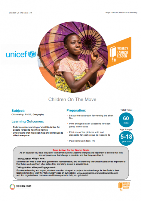 Children on the Move Corporate author: United Nations Children's Fund (UNICEF) World’s Largest Lesson is a collaborative education project to support the announcement of the United Nations Global Goals for Sustainable Development. Learning outcomes of the project: • Build an understanding of what life is like for people forced to flee their homes • Understand that migration has and continues to affect everyone