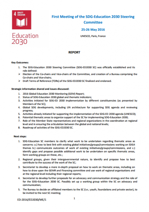First Meeting of the SDG-Education 2030 Steering Committee: report Year of publication: 2016 Corporate author: UNESCO The present report provides the first SDG-education 2030 Steering Committee meeting programme, a short summary of key outcomes and decisions, as well as a second part including a more detailed summary of deliberations reflecting the themes, issues and understandings emerging from the discussions.