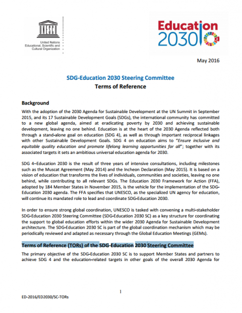 SDG-Education 2030 Steering Committee: Terms of Reference Year of publication: 2016 Corporate author: UNESCO This paper is the terms of reference of the SDG-Education 2030 Steering Committee.