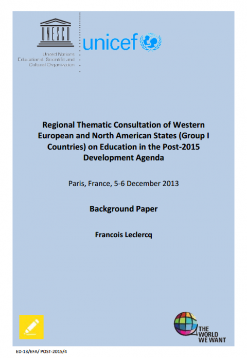 Regional thematic consultation of Western European and North American States (Group I Countries) on Education in the Post-2015 Development Agenda, Paris, France, 5-6 December 2013: background paper Year of publication: 2013 Author: François Leclercq Corporate author: United Nations Children's Fund (UNICEF) This paper first describes ongoing trends affecting education systems in Western Europe and North America , as well as Turkey, and reflects on their policy implications. The paper then analyses current indicators of education in the region and mentions key existing strategies and policies. Finally, it reflects on the relevance of the emerging post-2015 agenda for the region.