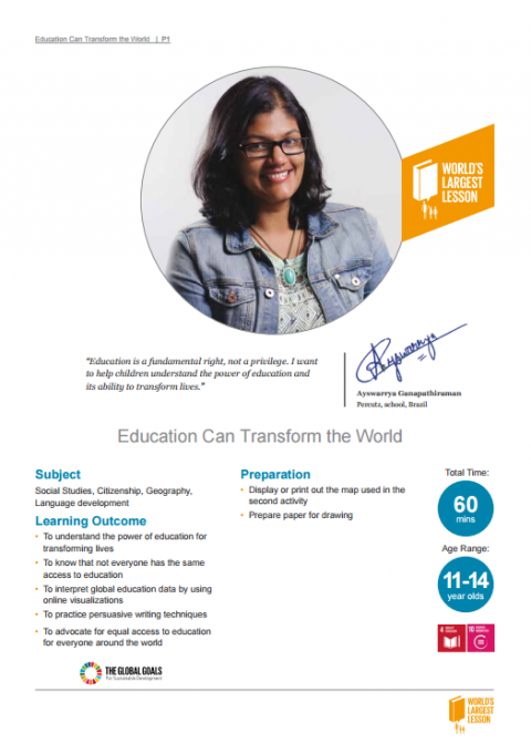 Education Can Transform the World Corporate author: United Nations Children's Fund (UNICEF) World’s Largest Lesson is a collaborative education project to support the announcement of the United Nations Global Goals for Sustainable Development.Learning outcomes of the project is: • To understand the power of education for transforming lives • To know that not everyone has the same access to education • To interpret global education data by using online visualizations • To practice persuasive writing techniques • To advocate for equal access to education for everyone around the world