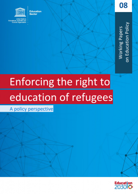 Enforcing the right to education of refugees: a policy perspective Year of publication: 2019 Corporate author: UNESCO This paper, aimed at education policymakers, provides analysis and insights on how the right to education for refugees could be ensured from a policy perspective. It does so by reviewing the current status of access to education of refugees, using the scant data that is available in this area. It also outlines some of the extensive barriers to education that refugees face, with recognition of the multifaceted, interlinked and complex nature of exclusion. It provides an overview of the international normative frameworks and global agendas on education that can be applied to refugees to ensure their right to education and achieve SDG 4. Additionally, this document presents practical examples, good practices, and promising measures taken by countries in order to ensure the inclusion of refugees in their national systems and better guarantee the fulfilment of their right to education. As a result of this research, collaboration and the invaluable contributions from the participants in a dedicated Expert Meeting in Barcelona (2018), a set of policy recommendations are provided in the last chapter which aims to guide policymakers to ensure equal access to good quality education for refugees.