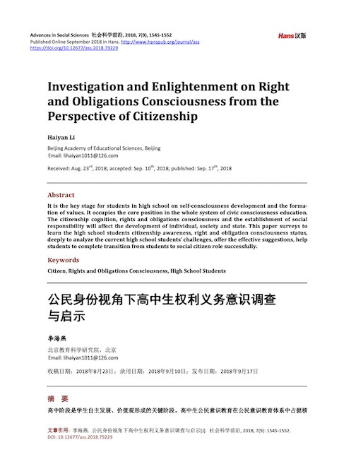 Investigation and Enlightenment on Right and Obligations Consciousness from the Perspective of Citizenship (Advances in Social Sciences; vol. 7, no. 9) Year of publication: 2018 Author: Li Haiyan It is the key stage for students in high school on self-consciousness development and the forma- tion of values. It occupies the core position in the whole system of civic consciousness education. The citizenship cognition, rights and obligations consciousness and the establishment of social responsibility will affect the development of individual, society and state. This paper surveys to learn the high school students citizenship awareness, right and obligation consciousness status, deeply to analyze the current high school students’ challenges, offer the effective suggestions, help students to complete transition from students to social citizen role successfully.