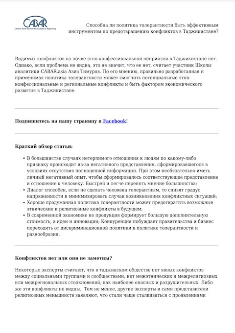 Can Tolerance Policy Be an Effective Tool for Conflict Prevention in Tajikistan? Year of publication: 2020 Author: Aziz Timurov Corporate author: Central Asian Bureau for Analytical Reporting (CABAR) | Institute for War and Peace Reporting (IWPR) There are no visible conflicts on the basis of ethnic-religious hostility in Tajikistan. However, if the problem is not visible, this does not mean that it does not exist, said Aziz Timurov, participant of the CABAR.asia School of Analytics. In his opinion, a well-developed and applicable tolerance policy can mitigate potential ethnic-religious and regional conflicts and be a factor in economic development in Tajikistan.