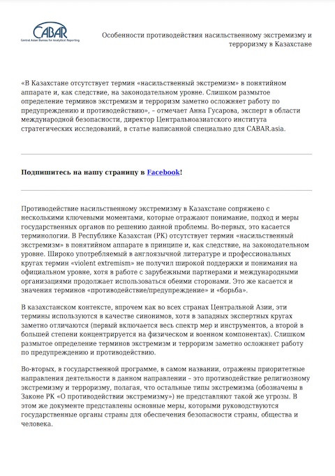 Features of Countering Violent Extremism and Terrorism in Kazakhstan Year of publication: 2019 Author: Anna Gusarova Corporate author: Central Asian Bureau for Analytical Reporting (CABAR) | Institute for War and Peace Reporting (IWPR) «In Kazakhstan there is no term as “violent extremism” in the conceptual construct, and as a result at the legislative level. Too vague definition of the terms extremism and terrorism significantly complicates the work on prevention and counteraction», – said Anna Gusarova, an expert in international security, director of the Central Asian Institute for Strategic Studies, in her article written specifically for CABAR.asia.