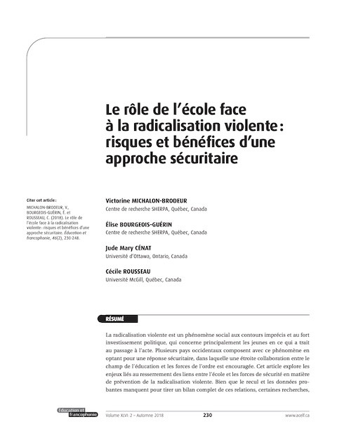 The Role of the School in Dealing With Violent Radicalization: The Risks and Benefits of a Safe Approach (Éducation et francophonie; vol. 46, no. 2) Year of publication: 2018 Author: Victorine Michalon-Brodeur | Élise Bourgeois-Guérin | Jude Mary Cénat | Cécile Rousseau Corporate author: Association canadienne d’éducation de langue française Violent radicalization is a social phenomenon with vague contours and strong political investment. Those mainly at risk of becoming involved are young people. Several Western countries are dealing with this phenomenon by opting for a security response, encouraging close collaboration between education and law enforcement. This article explores issues related to strengthening connections between the school and law enforcement for the prevention of violent radicalization. While there is a lack of evidence that would be needed to paint a full picture of these relationships, some studies on the impact of the War on Terror on young people and securing American schools in response to school shootings call for restraint. In light of these studies, this article argues that clear boundaries must be established between the mandates of the school and the police. The importance of these firewalls must be emphasized in the training school personnel in the prevention of violent radicalization in order to preserve the school’s ability to be a place that promotes the development of critical thinking and awareness of the Other.