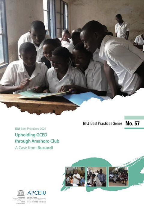 EIU Best Practices 2021: Upholding GCED through Amahoro Club; A Case from Burundi (EIU Best Practices Series; no.57) Year of publication: 2021 Author: Sinai Bakanibona Corporate author: APCEIU This monograph is one of APCEIU's EIU Best Practices Series, which aims to encourage educators, scholars, and activists to implement and share local initiatives on EIU. The Series No.57 introduces ‘Amahoro Clubs’ which means Peace Education Clubs. It is a project that has been initiated in other secondary schools of Burundi in terms of consolidating culture of peace and stability in Burundian society by applying different concepts of Global Citizenship Education in our life. This programme influence positively different social stratifications of people to know how to live together and be united by facing diverse challenges which can somber the population in violent conflicts. Amahoro Clubs serve as a platform in which people become aware of the various social issues. Students and teachers are gaining the necessary knowledge and skills that will help prevent the occurrence of conflicts.