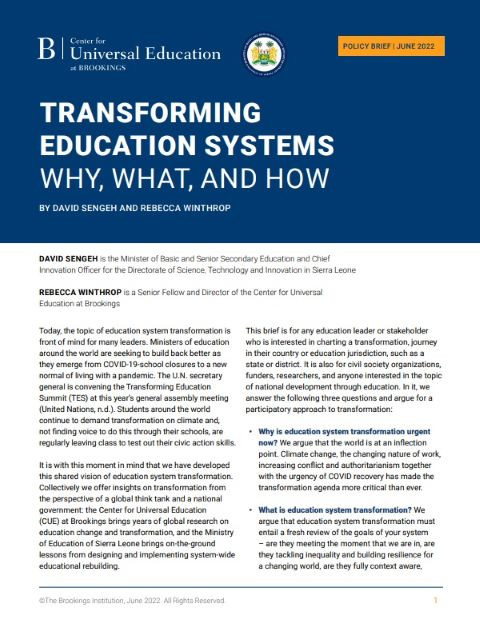 Transforming Education Systems: Why, What, and How Year of publication: 2022 Author: Rebecca Winthrop | David Sengeh Corporate author: Brookings Institution This brief is for any education leader or stakeholder who is interested in charting a transformation journey in their country or education jurisdiction such as a state or district. It is also for civil society organisations, funders, researchers, and anyone interested in the topic of national development through education. In it, the authors answer the following three questions and argue for a participatory approach to transformation: Why is education system transformation urgent now? The world is at an inflection point. Climate change, the changing nature of work, increasing conflict and authoritarianism together with the urgency of COVID recovery has made the transformation agenda more critical than ever. What is education system transformation? Education system transformation must entail a fresh review of the goals of your system – are they meeting the moment that we are in, are they tackling inequality and building resilience for a changing world, are they fully context aware, are they owned broadly across society – and then fundamentally positioning all components of your education system to coherently contribute to this shared purpose. How can education system transformation advance in your country or jurisdiction? Three steps are crucial: Purpose (developing a broadly shared vision and purpose), Pedagogy (redesigning the pedagogical core), and Position (positioning and aligning all components of the system to support the pedagogical core and purpose). Deep engagement of educators, families, communities, students, ministry staff, and partners is essential across each of these 3P steps.