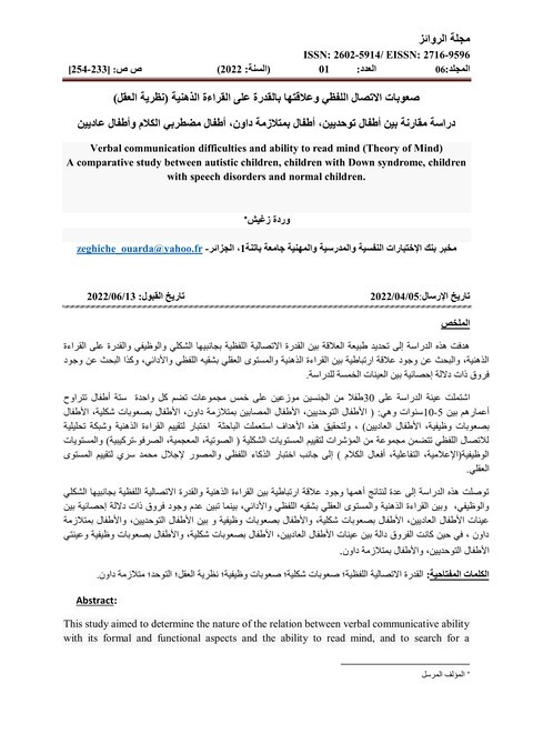 Verbal Communication Difficulties and Ability to Read Mind (Theory of Mind): A Comparative Study Between Autistic Children, Children with Down Syndrome, Children with Speech Disorders and Normal Children (Novels Magazine; Vol.6, No.1) Year of publication: 2022 Author: Zaghish Warda Corporate author: Batna 1 University This study aimed to determine the nature of the relation between verbal communicative ability with its formal and functional aspects and the ability to read mind, and to search for a correlation between mind reading and the mental level in both its verbal and performance aspects, as well as searching for the existence of statistically significant differences between the five samples of the study.The study sample included 30 children of both sexes distributed into five groups, each includes six children between the ages of 5-10 years: (Autistic children, children with Down syndrome, children with formal difficulties, children with functional difficulties,normal children), and to achieve these Objectives the researcher used a test to assess mental reading and an analysis grid for verbal communication, , in addition to the verbal and visual intelligence test of Ejlal Muhammad Serri to assess the mental level .This study reached several results: a correlation between mental reading and verbal communicative ability in its formal and functional aspects, and between mind reading and the mental level in both its verbal and performance aspects, while it was found that there were no statistically significant differences between the samples of normal children, children with formal difficulties, children with functional difficulties, autistic children, and children with Down syndrome, while the differences were significant between samples of normal children, children with formal difficulties, children with functional difficulties and the two samples of autistic children, and children with Down syndrome.