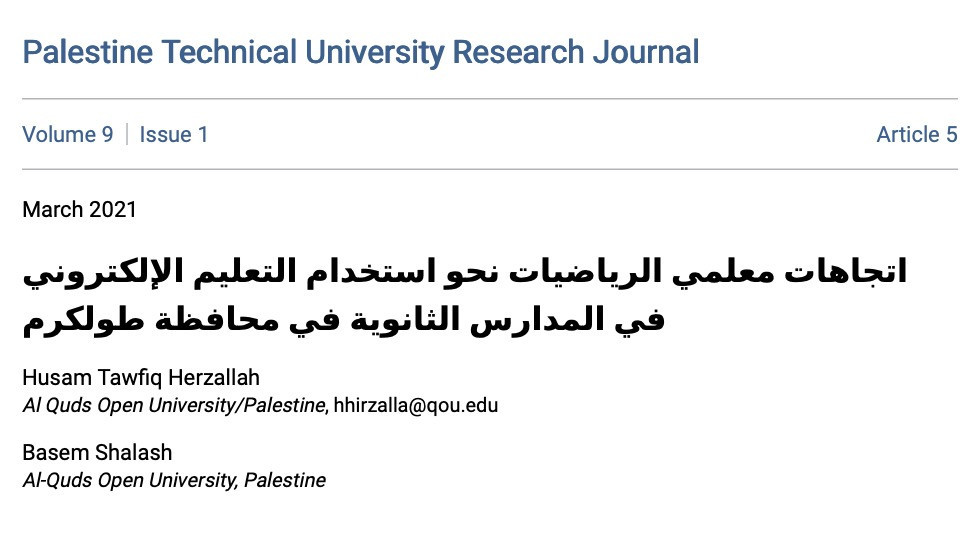 The Attitudes of Mathematics Teachers towards the use of e-learning at Secondary Schools in Tulkarm District Year of publication: 2021 Author: Husam Tawfiq Herzallah Basem Shalash Corporate author: Al-Quds Open University This study aimed to identify the attitudes of math teachers towards the use of electronic education in the secondary schools in Tulkarm Governorate, the study also identified the impact of the study variables (gender, educational qualification, experience, and the ability to use the computer) on the attitudes of teachers. The researchers used the descriptive analytical method, the study sample consisted of (83) male and female teachers (36) of them are female teachers and the remaining others (47) are male teachers, the researchers used a questionnaire which consists of (35) items, which were applied in the second semester of the academic year (2019/2020) ).The results of the study showed that the attitudes of the sample members towards e-learning were medium average, the results of the study showed that there were many differences in the attitudes according to the gender variable and in favor of males, and no differences appeared or emerged according to other variables. The researchers presented many recommendations and suggestions, the most important of them are: holding scientific courses, and seminars with the aim of spreading awareness and knowledge of e-learning and its benefits on the educational process and encouraging teachers to practice different types of e-learning, as well as studying students' attitudes toward using e-learning.