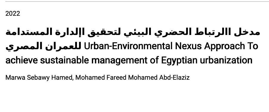 Urban-Environmental Nexus Approach To achieve sustainable management of Egyptian urbanization Year of publication: 2022 Author: Marwa Sebawy Hamed, Mohamed Fareed Mohamed Abd-Elaziz In view of the high rates of population growth witnessed by urban communities, and the resulting continuous increase in pressures on water, energy and food resources, which generates some issues facing societies such as economic turmoil, issues related to climate change and other urgent issues that need intervention. This is to try to achieve the principles and goals of sustainable development for these communities, as one of the most important reasons for these issues is the unilateral sectoral decisions and plans to deal with these issues and the lack of integrated plans that preserve resources in general and achieve the goals of sustainable development. Therefore, the research aims to formulate a methodological framework to achieve sustainable management of the Egyptian urbanization by applying the approach of the urban environmental link with the Egyptian urban agglomerations, to achieve the goals of sustainable development and provide the requirements of population growth. Where the research studies the concepts of sustainable urban management in the light of applying the urban-environmental nexus approach, and its role in achieving the dimensions of sustainable management and focusing on the basic principles of water, energy and food sustainability in urban agglomerations. This requires defining the foundations and criteria for achieving sustainable management based on the interdependence and interdependence of sectoral and integrated plans in order to meet current and potential challenges and pressures. The research also deals with many different international experiences to understand the integrated interrelationships between the water, energy and food sectors, taking into account the specificity of the Egyptian case. In order to reach an initial methodological framework for achieving sustainable management of the Egyptian urbanization, this framework is reviewed by presenting it to experts and specialists in the field in order to reach the final methodological framework for achieving sustainable management of the Egyptian urbanization.