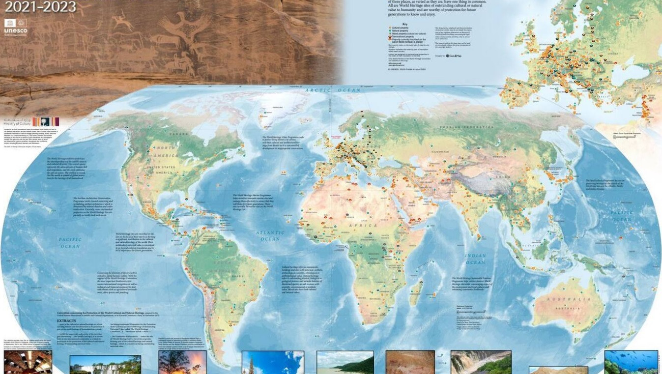 2021-2023 World Heritage Map Published Year of publication: 2023 Corporate author: UNESCO World Heritage Convention The latest version of the World Heritage map, produced by the World Heritage Centre and Geo4Map with the generous support of the Kingdom of Saudi Arabia, can now be ordered from the World Heritage Centre website.The featured image on the map presents the Ḥimā Cultural Area World Heritage property in Saudi Arabia, country hosting the next session of the World Heritage Committee in September 2023.This poster-sized wall map features all 1,157 World Heritage properties and is illustrated with magnificent photos and explanatory captions. It also presents brief explanations of the World Heritage Convention and its related Marine, Earthen Architecture and other conservation programmes.