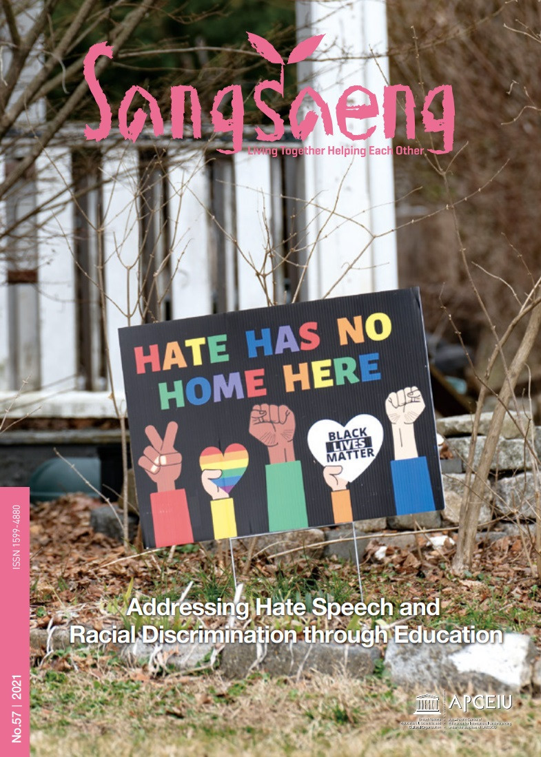 Addressing Hate Speech and Racial Discrimination through Education (SangSaeng no.57, 2021) Year of publication: 2023 Corporate author: APCEIU Today, humanity is faced with various multifaceted challenges such as climate change, increasing inequality, hate speech and racial discrimination. Moreover, the COVID-19 pandemic has crudely manifested those problems and further highlighted the acute need for concerted efforts to address them. In this context, SangSaeng No. 57 focuses on “Addressing Hate Speech and Racial Discrimination through Education” to provide readers with opportunities to reflect on these salient issues. Contents 03 Editor’s Note 04 Special ColumnFrom Hatred to Reconciliation - Learning from Rwanda / Freddy Mutanguha 08 FOCUS: Addressing Hate Speech and Racial Discrimination through Education08 Confronting Hate Speech - Thoughts, Challenges, Proposals from Educational Perspective / Gabriela Martini Armengol12 Missing Link in Global Citizenship Education – Taking into Account Identities, Alterities and Citizenships Hurt by Systemic and Chronic Racism / Gina Thesee16 Moving from Hate and Discrimination to Greater Humanity – Increasing Need for Empathy Education / Pat Dolan19 But What Can I Do? - Educational Responses to Hate Speech / Felisa Tibbitts 23 Best Practices23 Learning Democracy at Utoya - Young People’s Response to Hate and Extremism / Ingrid Aspelund26 Combatting Hate Speech – Experiences and Lessons from South Sudan / Marina Modi 29 Special Report29 Setting out Priorities for Addressing Hate Speech Through Educationt - Highlights of the Multi-Stakeholder Forum and Global Education Ministers Conference on Addressing Hate Speech through Education / UNESCO 32 Call for Global Action towards Transforming the World through Education - Highlights of the 5th UNESCO Forum on Transformative Education / APCEIU and UNESCO 35 Story TimeGrandfather’s Funeral / Sudipa Charkraverty 38 Peace in My MemoryPeace Turned into Pain / An anonymous contributor from Afghanistan 42 Understanding the Asia and the PacificMha Puja, Practicing Respect / Sharareh Bajracharya and Sanjeev Maharjan 45 Youth Network Youth Tackling Hate Speech and Racial Discrimination / GCED Youth Network Core Team 48 LetterReflections on Hate Speech and GCED / Sengpapah Holanouphab 50 APCEIU in Action