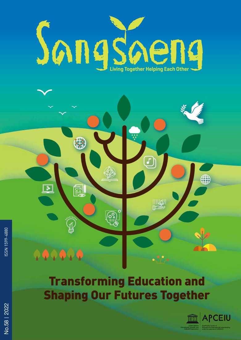 Transforming Education and Shaping Our Futures Together (SangSaeng no.58, 2022) Corporate author: APCEIU As humanity is facing unprecedented social, economic and environmental challenges, positive changes are necessary. And education plays a key role in adapting and responding to a changing world as it can be the most reliable tool to shape our future into a more inclusive, sustainable, and just world. In this context, SangSaeng No. 58 focuses on “Transforming Education and Shaping Our Futures Together” with the goal of exploring possible alternatives to educational systems and practices. Contents 03 Editor’s Note 04 Special ColumnTransformative Education for Learning to Live Together / Lim Hyun Mook 08 FOCUS: Transforming Education and Shaping Our Futures Together 08 Global Movement to Educate for Peace – Develop Hope by Focusing on an Educational Renaissance that’s Deliberate / Fernando M. Reimers 12 University as the Foundation of Education – Effective Education System Discovers Attributes that Help to Excel / Madhav Das Nalapat 15 Vision for a Feminist, Decolonized Education – Develop Two-accountability Education that Furthers Today’s Standard / Shamah Bulangis 19 Best Practices 19 Best of Both Worlds – Collaborative Approach to Transforming Education / Dailess Banda-Zulu and Sibylle Freiermuth 23 Leading Impactful Transformation in Local Community – Grassroots Level Educational Innovation that Inspires Future Action / IniOluwa Odekunle 26 Special Report 26 Asia-Pacific Education Ministers Call for Responsive Covid-19 Learning Recovery, Transformation of Education Systems – Highlights of the Second Asia-Pacific Regional Education Minister’s Conference (APREMC-II) / Jenelle Babb, Worapot Yodpet, Seek Ling Tan 29 Transforming Education: A Call to Action – Education Stakeholders Gather to Reimagine Education and Revitalize Commitments at the Transforming Education Pre-Summit / Transforming Education Summit Secretariat 32 Story TimeMy Role Model Teacher / Joseph Sandamira 34 Letter OneCambodian Approach Toward Educational Development for Better Future Connectedness, Readiness / Mok Sarom 36 Peace in My MemoryLost and Found Peace in War Times – Defining Secret Puzzle of Peace in War-torn Ukraine / Valeria Moroz 40 Understanding the Asia and the PacificBringing Living Heritage to Asia-Pacific Classrooms – Contextualizing School Activities with Living Heritage Supports Teachers, Improves Learning Outcomes, Safeguards Living Heritage / Duong Bich Hanh and Vanessa Achilles 44 GCED Youth Network Shapers for Today and Tomorrow’s Education – Youth Tackle Educational Topics to Further Develop, Improve, Transform / Diego Manrique 47 Letter TwoSupporting Global Citizenship Education in Kenya / Jane Nyaga 49 APCEIU in Action