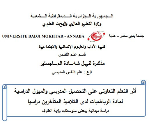 The Effect of Cooperative Learning on School Achievement and Academic Tendencies for Mathematics among School-related Students Year of publication: 2012 Author: Burio Murad Corporate author: Baji Mukhatar University Academic delay is a prevalent problem in the educational setting, and it is one of the most frequently addressed by researchers and professionals. It has no detrimental influence on the student's psychological development since it impedes his academic progress and cognitive development, given that this stage is a stage of diverse growth, as it is physical, psychological, emotional, and cognitive. It also contributes to wasting financial resources allocated to education and, accordingly, the repercussions of the phenomenon extend to the family and society as a whole. Those who are falling behind in school typically have a normal level of intelligence and good physical condition, but their level of achievement is lower than their true level or the level expected of them.In this study, the focus was on the cooperative learning strategy to verify its effectiveness in increasing students’ achievement in mathematics and improving their inclinations towards it.