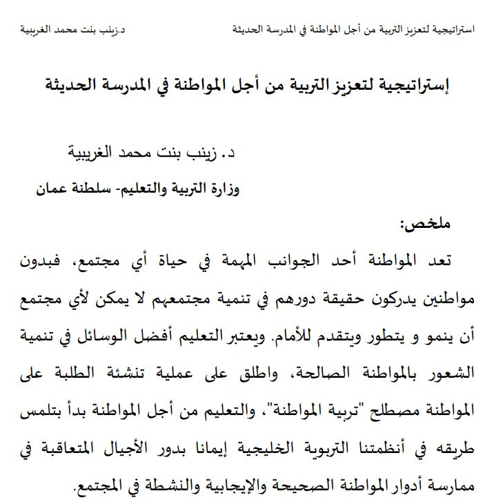 A Strategy for Promoting Citizenship Education in the Modern School Year of publication: 2015 Author: Zayneb Algharibi Corporate author: Mohamed Lamin University Citizenship is regarded as an important aspect in the life of community. With the lack of citizens who do not realize their role in the development of their community, no society/ or community will be able to progress, grow, and develop. Since education is the best means to develop good citizenship, the process of bringing up students into citizenchip is called 'citizenship education', and because of its importance, education for citizenship has begun to be integrated within the educational systems of Gulf countries ; for the fact of the role of our successive generations in exercising the different roles of citizenship and positive activities in society.The present paper highlights the strategy to strengthen and promote citizenship education in the modern school; It seeks to answer the following questions:What the modern concept of education for citizenship?What is the justifications for giving much concern to education for citizenship in the modern school?What steps that should be used to strengthen education for citizenship at school?