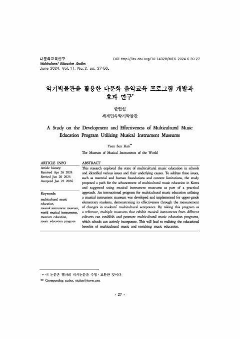 악기박물관을 활용한 다문화 음악교육 프로그램 개발과 효과 연구 (다문화교육연구; Vol. 17, No. 2) Year of publication: 2024 Author: 한연선 Corporate author: 한국다문화교육학회 본 연구는 학교 다문화 음악교육의 현실을 돌아보고 몇 가지 문제점과 그 원인을 진단했다. 이렇게 도출된 물적 • 인적 토대와 내용적 한계 등 당면한 여러 문제를 극복하기 위해 우리 사회 다문화 음악교육이 나아가야 할 방향을 타진하고, 그 실천적 방안으로서 악기박물관을 활용한 다문화 음악교육을 제안하였다. 초등학교 고학년을 대상으로 악기박물관을 활용한 다문화 음악교육 프로그램을 개발 • 적용하고, 학생들의 다문화수용성의 변화를 측정해 프로그램의 효과를 입증하였다. 세계 악기를 소장한 여러 박물관이 이를 참고해 다문화 음악교육 프로그램을 활성화하고 학교가 이를 적극 활용한다면 음악이 가진 다문화 교육적 효용을 성취하고 음악교육을 더욱 풍성하게 만들 수 있을 것이다.