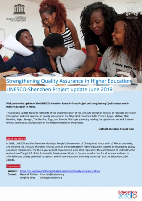 Strengthening Quality Assurance in Higher Education UNESCO-Shenzhen Project Update, June 2019 Year of publication: 2019 Corporate author: UNESCO In 2016, UNESCO and the Shenzhen Municipal People’s Government of China joined hands with 10 African countries, and initiated the UNESCO-Shenzhen Project, with an aim to strengthen higher education systems by developing quality assurance mechanisms. The three-year project implemented since 2017 represents the commitment of UNESCO to the realization of Target 4.3 of the Sustainable Development Goals to “ensure equal access for all women and men to affordable and quality technical, vocational and tertiary education, including university” and the Education 2030 agenda.
