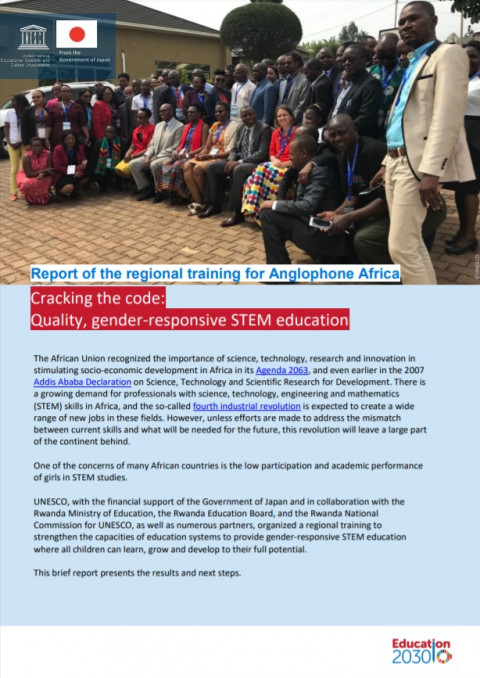 Report of the regional training for Anglophone Africa, Cracking the code: quality, gender-responsive STEM education Year of publication: 2019 Corporate author: UNESCO The African Union recognized the importance of science, technology, research and innovation in stimulating socio-economic development in Africa in its Agenda 2063, and even earlier in the 2007 Addis Ababa Declaration on Science, Technology and Scientific Research for Development. There is a growing demand for professionals with science, technology, engineering and mathematics (STEM) skills in Africa, and the so-called fourth industrial revolution is expected to create a wide range of new jobs in these fields. However, unless efforts are made to address the mismatch between current skills and what will be needed for the future, this revolution will leave a large part of the continent behind. One of the concerns of many African countries is the low participation and academic performance of girls in STEM studies. UNESCO, with the financial support of the Government of Japan and in collaboration with the Rwanda Ministry of Education, the Rwanda Education Board, and the Rwanda National Commission for UNESCO, as well as numerous partners, organized a regional training to strengthen the capacities of education systems to provide gender-responsive STEM education where all children can learn, grow and develop to their full potential. This brief report presents the results and next steps.