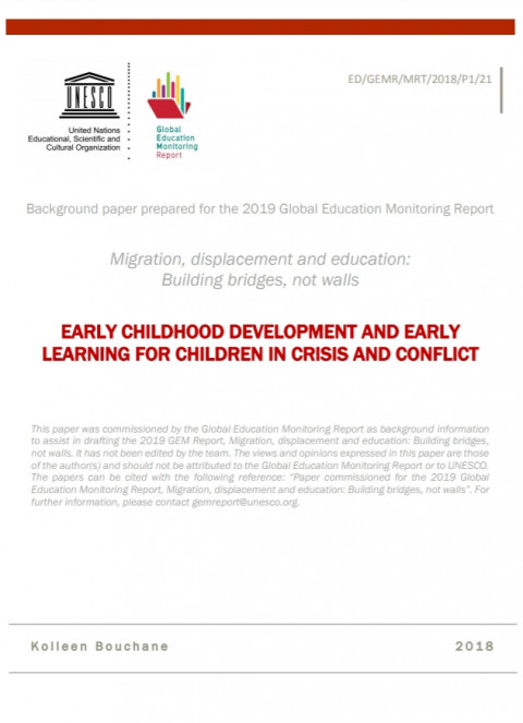 Early Childhood Development and Early Learning for Children in Crisis and Conflict Year of publication: 2018 Author: Kolleen Bouchane Corporate author: Global Education Monitoring Report Team There is an urgent need for a comprehensive response, including early learning and family support programs, to the rapidly growing population of young children worldwide living in crisis and conflict. Substantial evidence from neuroscience to economics indicates that the early years of a child’s life lay the foundation for long-term health, learning and behavior. The first months and years are not only a critical period in an individual child’s lifelong capacity for learning, but weak learning foundations of children can compromise the long-term development of nations. Yet a review of Refugee and Humanitarian Response Plans conducted for this paper revealed that only 9 percent of plans included the essential elements of early learning. Relative to health and nutrition programming, early education and parenting interventions were more likely to be omitted from the Response Plans.The rationale for focusing new attention on the educational needs of young children living in fragile conditions is strong: there is a broad body of scientific evidence; the international legal framework of the United Nations Convention of the Rights of the Child asserts that all children have the right to health, education, legal registration, and protection from violence and separation from parents, beginning at birth; and the Sustainable Development Goals for all will be not reached without a focus on the earliest years of life in crisis and conflict situations. This background paper presents the case for increased attention and investment in early childhood in conflict and crisis contexts, with focused attention on early learning and family support. The scale of the problem, current science and evidence, current global standards and principles, and case studies are all discussed and priority recommendations are offered.