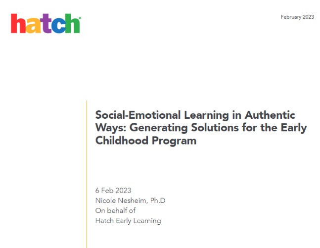Social-Emotional Learning in Authentic Ways: Generating Solutions for the Early Childhood Program Year of publication: 2023 Author: Nicole Nesheim Corporate author: Hatch Early Learning In the post-pandemic field of education, the inclusion of social-emotional learning into early childhood education has been stressed as highly important. But what is social-emotional learning, exactly, and why is it so important now? Social-emotional learning is the practice of teaching the whole child, not simply core subjects and the arts.