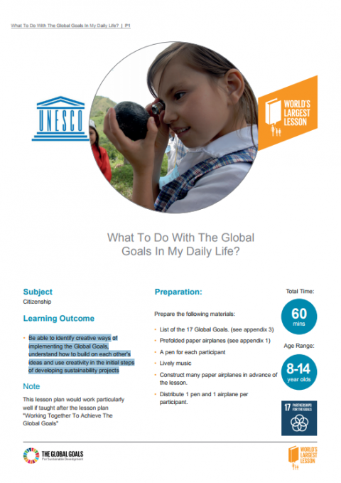 What To Do With The Global Goals In My Daily Life? Corporate author: United Nations Children's Fund (UNICEF) Learning outcomes: Be able to identify creative ways of implementing the Global Goals, understand how to build on each other’s ideas and use creativity in the initial steps of developing sustainability projects