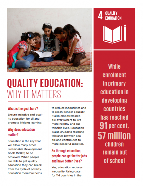 Quality Education: Why It Matters Corporate author: United Nations Children's Fund (UNICEF) Education is the key that will allow many other Sustainable Development Goals (SDGs) to be achieved. When people are able to get quality education they can break from the cycle of poverty. Education therefore helps to reduce inequalities and to reach gender equality. It also empowers people everywhere to live more healthy and sustainable lives. Education is also crucial to fostering tolerance between people and contributes to more peaceful societies.