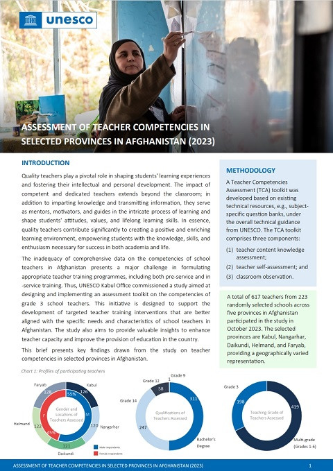 Assessment of Teacher Competencies in Selected Provinces of Afghanistan (2023) Year of publication: 2024 Corporate author: UNESCO Kabul UNESCO Kabul Office commissioned a study aimed at assessing the competencies of Grade 3 teachers. A total of 617 teachers from 223 randomly selected schools across five provinces in Afghanistan participated in the study. Overall, although surveyed grade 3 teachers demonstrated a high level of self-perception regarding teaching competencies, they had low content knowledge. There remained room for improvement in terms of pedagogical skills among participating teachers.