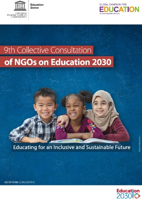 9th Collective Consultation of NGOs on Education 2030: Educating for an Inclusive and Sustainable Future Year of publication: 2020 Corporate author: UNESCO | Global Campaign for Education (GCE) This includes proceedings and key messages of the 9th Global meeting of the Collective Consultation of NGOs on Education 2030 (CCNGO 2019) organized by UNESCO from 2-5 December 2019 in Hammamet, Tunisia and generously hosted by the Global Campaign for Education (GCE), alongside the Arab Campaign for Education for All (ACEA) and the National Association of the Right to Education (ANDET). The CCNGO 2019 aimed to build on CSOs(Civil Society Organisations) experiences and strong commitments to strengthen collective initiatives towards the realisation of the SDGs and education related targets. The focus and major theme of the Meeting was the role and engagement of civil society organizations in supporting equity and inclusion in the implementation of SDG4-Education 2030 at national, regional and global level.