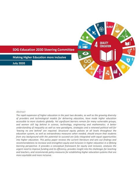 SDG-Education 2030 Steering Committee: Making Higher Education More Inclusive, July 2020 Year of publication: 2020 Corporate author: UNESCO The rapid expansion of higher education in the past two decades, as well as the growing diversity of providers and technological models for delivering education, have made higher education accessible to more students globally. Yet significant barriers remain for many vulnerable groups, and women still lag behind in science, technology, engineering and mathematics. A better understanding of inequality as well as new paradigms, strategies and a renewed political will for ‘leaving no one behind’ are required. Structural equity policies at all levels throughout the education system, as well as extraordinary measures when needed, should ensure that students from any background with the potential to succeed are fully integrated with equal opportunities into higher education. This policy paper reviews the current literature and sets out findings and recommendations to increase and strengthen equity and inclusion in higher education in a lifelong learning perspective. It provides a conceptual framework for equity and inclusion, analyses the urgent need to improve funding and its efficiency, provides insight into the challenges for teaching and teachers, and recommends policy measures for establishing higher education systems that are more equitable and more inclusive.