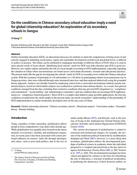 Do the Conditions in Chinese Secondary School Education Imply a Need for Global Citizenship Education? an Exploration of Six Secondary Schools in Jiangsu (Asia Pacifc Education Review; Rev. 21) Year of publication: 2020 Author: Yi Hong Corporate author: Seoul National University. Education Research Institute Global citizenship education (GCE), an educational advocacy for students to attain the competencies of being aware of and actively engaged in defending social justice, equity and sustainable development at both local and global levels, is difficult to achieve in practice. The failure can be attributed to inadequate knowledge of different effects of GCE when it is used to meet specific needs of local schools. Identifying local schoolsโ needs for GCE may help educators put GCE to good use. However, few studies explore and justify the role of a local insight in assisting in GCE implementation, especially regarding the situation in China where inconsistencies are found across curriculum documents, research and educational practices. The present study fills the gap by investigating the schoolsโ needs for GCE at secondary level within the Chinese education system. With the assistance of principals (nโ=โ6) and teachers (nโ=โ10) from six participating schools in an anonymous city in Jiangsu province, data were collected through semi-structured interviews and then analysed abductively using the grounded theory approach. Analysis was initially framed by employing criteria from a curriculum development method, namely situational analysis, based on which further analysis was conducted to synthesise more abstract themes. As a result, four general conditions emerged from the data, including three restrictive conditions that may prevent GCE integration (i.e. โcompliance and commitmentโ, โsocial mobilityโ and โadministrative constraintsโ) and one condition that can encourage GCE implementation (i.e. โcompetency-based educationโ). Since GCE is a complex idea linked to many possible applications, the four key conditions revealed from the small sample in the present study can enrich researchersโ understanding of the potentiality of GCE implementation in similar moderately developed cities on the east coast of China.