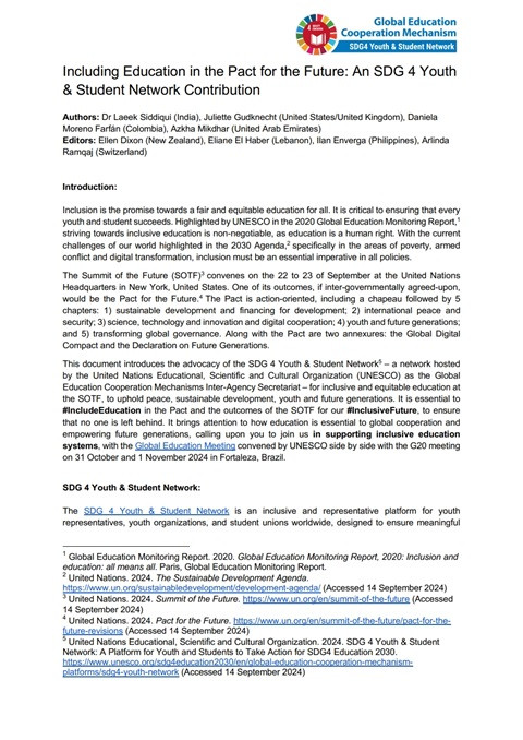 Including Education in the Pact for the Future: An SDG 4 Youth & Student Network Contribution Year of publication: 2024 Author: Laeek Siddiqui | Juliette Gudknecht | Daniela Moreno Farfán | Azkha Mikdhar Corporate author: SDG 4 Youth & Student Network | UNESCO Inclusion is the promise towards a fair and equitable education for all. It is critical to ensuring that every youth and student succeeds. Highlighted by UNESCO in the 2020 Global Education Monitoring Report, striving towards inclusive education is non-negotiable, as education is a human right. With the current challenges of our world highlighted in the 2030 Agenda, specifically in the areas of poverty, armed conflict and digital transformation, inclusion must be an essential imperative in all policies. The Summit of the Future (SOTF) convenes on the 22 to 23 of September at the United Nations Headquarters in New York, United States. One of its outcomes, if inter-governmentally agreed-upon, would be the Pact for the Future. The Pact is action-oriented, including a chapeau followed by 5 chapters: 1) sustainable development and financing for development; 2) international peace and security; 3) science, technology and innovation and digital cooperation; 4) youth and future generations; and 5) transforming global governance. Along with the Pact are two annexures: the Global Digital Compact and the Declaration on Future Generations. This document introduces the advocacy of the SDG 4 Youth & Student Network – a network hosted by the United Nations Educational, Scientific and Cultural Organization (UNESCO) as the Global Education Cooperation Mechanisms Inter-Agency Secretariat – for inclusive and equitable education at the SOTF, to uphold peace, sustainable development, youth and future generations. It is essential to #IncludeEducation in the Pact and the outcomes of the SOTF for our #InclusiveFuture, to ensure that no one is left behind. It brings attention to how education is essential to global cooperation and empowering future generations, calling upon you to join us in supporting inclusive education systems, with the Global Education Meeting convened by UNESCO side by side with the G20 meeting on 31 October and 1 November 2024 in Fortaleza, Brazil.