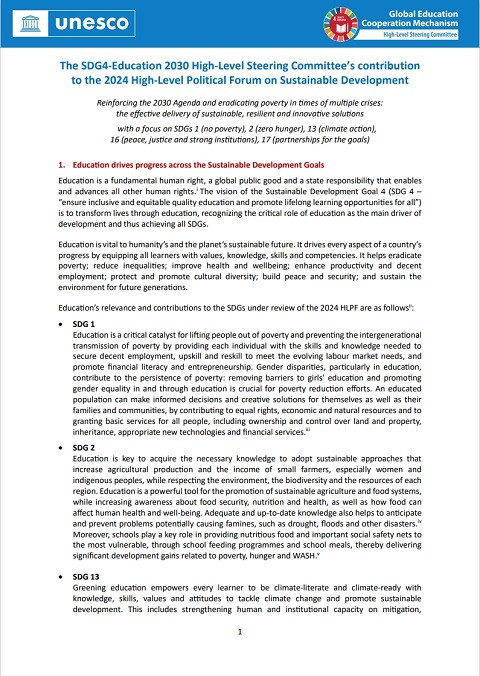 SDG4 High-Level Steering Committee Input Paper for the 2024 High-Level Political Forum on Sustainable Development Year of publication: 2024 Corporate author: SDG4 High-Level Steering Committee In alignment with theHigh-level Political Forum on Sustainable Development (HLPF)’s focus for 2024, this SDG4 High-Level Steering Committee paper provides specific inputs as they relate to the following Sustainable Development Goals: Goal 1. End poverty in all its forms everywhere; Goal 2. End hunger, achieve food security and improved nutrition and promote sustainable agriculture; Goal 13. Take urgent action to combat climate change and its impacts; Goal 16. Promote peaceful and inclusive societies for sustainable development, provide access to justice for all and build effective, accountable and inclusive institutions at all levels; and Goal 17. Strengthen the means of implementation and revitalize the Global Partnership for Sustainable Development.