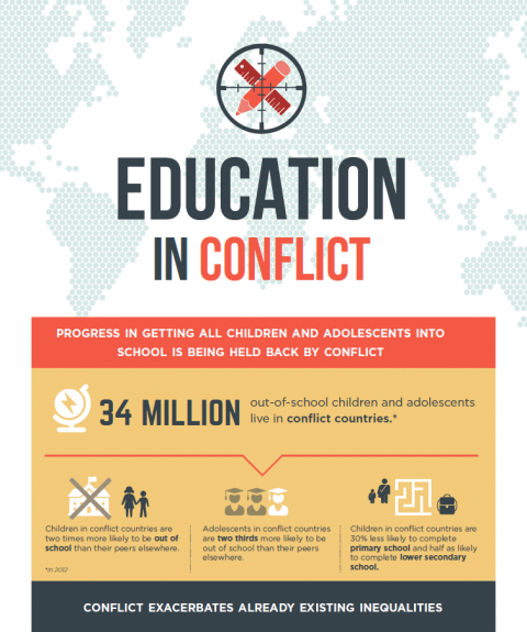 EDUCATION IN CONFLICT Corporate author: EFA Global Monitoring Report Team | UNESCO PROGRESS IN GETTING ALL CHILDREN AND ADOLESCENTS INTO SCHOOL IS BEING HELD BACK BY CONFLICT - 34 million out-of-school children and adolescents live in conflict countries. - Children in conflict countries are two times more likely to be out of school than their peers elsewhere.- Adolescents in conflict countries are two thirds more likely to be out of school than their peers elsewhere.- Children in conflict countries are 30% less likely to complete primary school and half as likely to complete lower secondary school.- Girls are almost two and a half times more likely to be out of school if they live in a conflict country than those elsewhere.- Adolescent girls are almost 90% more likely to be out of secondary school than young women elsewhere.- The poorest children in conflict countries are twice as likely to be out of school as the poorest elsewhere.