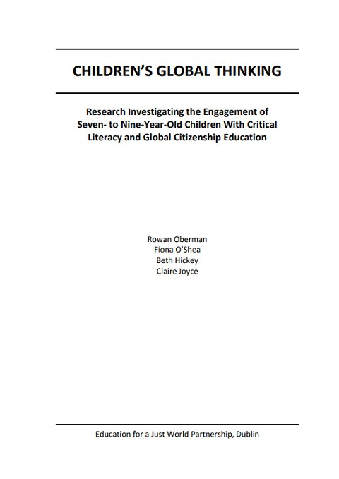 Children's Global Thinking: Research Investigating the Engagement of Seven-to-Nine-Year Old Children with Critical Literacy and Global Citizenship Education Year of publication: 2014 Author: Rowan Oberman | Fiona O’Shea | Beth Hickey | Claire Joyce Corporate author: Education for a Just World Partnership | St. Patrick's College | Trócaire | Centre for Human Rights and Citizenship Education (CHRCE) The focus of this research is two-fold. Firstly, it investigates how children aged seven to nine years conceptualise global and justice issues. Secondly, it explores children’s engagement with critical literacy strategies as part of a global citizenship education programme. This research project is undertaken with the intention of providing an empirical basis to support the development of pedagogy integrating global citizenship education into different curriculum areas.