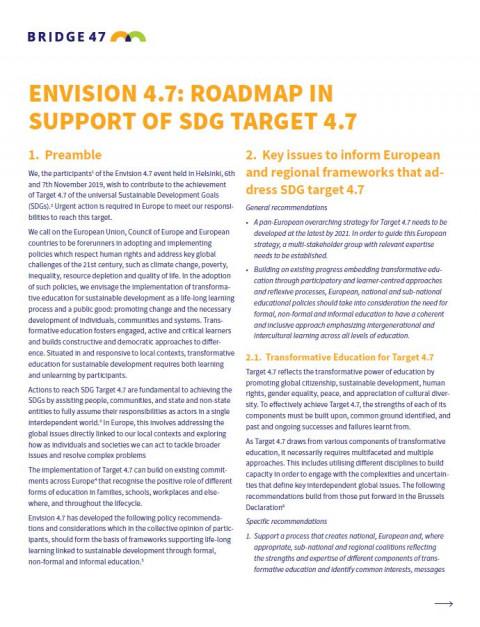 Resources: For SDG Target 4.7 Year of publication: 2021 Author: Sandra Oliveira Corporate author: Bridge 47 This paper is part of a series of publications commissioned to support advocacy for more space for SDG Target 4.7 of Agenda 2030 in European and global policies. In November 2019, Bridge 47 organised an event called Envision 4.7, which brought together civil society organisations, national governments, MEPs, European and global organisations, and together wrote a Roadmap for SDG Target 4.7 for Europe.Focusing on the key themes of this Envision 4.7 Roadmap and drawing on the Envision 4.7. policy papers as key references, this paper focuses on providing a global overview and identification of the types of resources re- quired to achieve this target.\