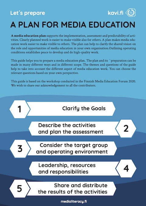 Let's Prepare: A Plan For Media Education Year of publication: 2020 Corporate author: KAVI National Audiovisual Institute (Finland) This guide helps you to prepare a media education plan. The plan and its preparation can be made in many different ways and in different scope. The themes and questions of the guide help to take into account the different aspect of media education work. You can choose the relevant questions based on your own perspective. This guide is based on the workshop conducted in the Finnish Media Education Forum 2020.