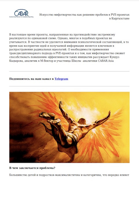The Art of Mythmaking as a Solution to Gaps in PVE Projects in Kyrgyzstan Year of publication: 2020 Author: Kunduz Kydyrova Corporate author: Central Asian Bureau for Analytical Reporting (CABAR) | Institute for War and Peace Reporting (IWPR) Currently, projects aimed at countering extremism are being implemented according to the same scheme. However, much is not considered in such projects. In particular, no attention is paid to the psychological component, while the perception of ideas and information received is key in the spread of radical ideologies. Kunduz Kydyrova, an analyst at M-Vector and a member of the CABAR.asia School of Analytics, discusses the need to apply a transdisciplinary approach in PVE projects and how mythmaking can help increase the effectiveness of such initiatives.