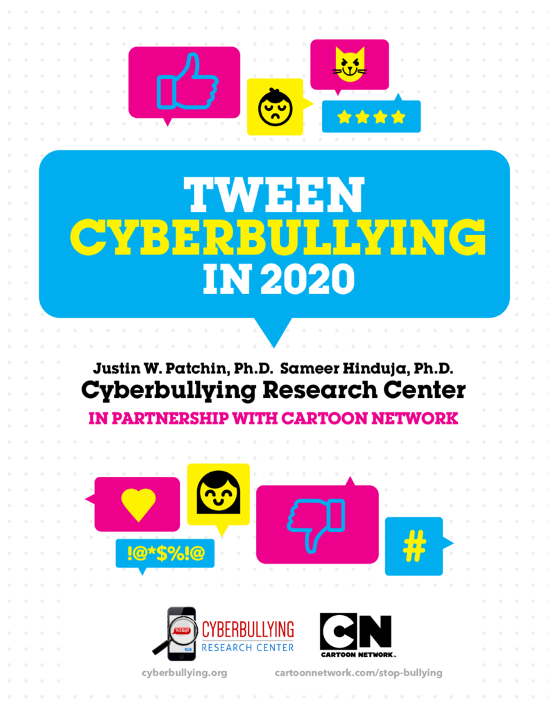 Tween Cyberbullying in 2020 Year of publication: 2020 Author: Justin W. Patchin | Sameer Hinduja Corporate author: Cyberbullying Research Center | Cartoon Network This report presents the results of a nationally representative survey of 1,034 children between the ages of 9 and 12 years-old. The survey was conducted online from June 19 through July 6, 2020, and was fielded by Ipsos using their probability-based KnowledgePanel. KnowledgePanel is the largest online panel that is representative of the U.S. population. KnowledgePanel recruitment employs an addressed-based sampling methodology from the United States Postal Service’s Delivery Sequence File—a database with full coverage of all delivery points in the U.S. As such, samples from KnowledgePanel cover all households regardless of their phone status. Member households without Internet access are furnished with a free computing device and Internet service. KnowledgePanel members are randomly recruited through probability-based sampling, and panel members are randomly selected so that survey results can properly represent the U.S. population with a measurable level of accuracy, features that are not obtainable from nonprobability panels. Ipsos currently recruits panel members by using address-based sampling methods (the firm previously relied on random-digit dialing for recruitment). Households without Internet connection are provided with a web-enabled device and free Internet service. In contrast, “convenience” or “opt-in” surveys recruit participants through emails, word-of-mouth, pop-up ads online, or other non-scientific methods.