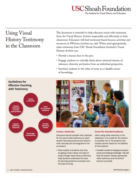 Using Visual History Testimony in the Classroom This short document published by the USC Shoah Foundation gives teachers basic key elements to integrate visual testimonies in class. The 4-page document provides constructive principles of learning applicable to all kind of digital approaches.