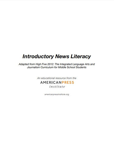 Introductory News Literacy: Adapted from High Five 2012: The Integrated Language Arts and Journalism Curriculum for Middle School Students Year of publication: 2013 Corporate author: American Press Institute The American Press Institute’s Introductory News Literacy Units are lightweight general usage lesson plans for introducing middle school students to how to read and understand news media and current events. While the Institute offers more specific and in-depth materials and ideas for promoting news literacy, these new units provide a resource for the time-pressed teacher working with students at an important age. Split into three units of one-to-two weeks each, the curriculum briefly overviews critical elements in news understanding and healthy processes for determining source information and bias. Individual lessons can be adapted and used to fit specific classroom needs.
