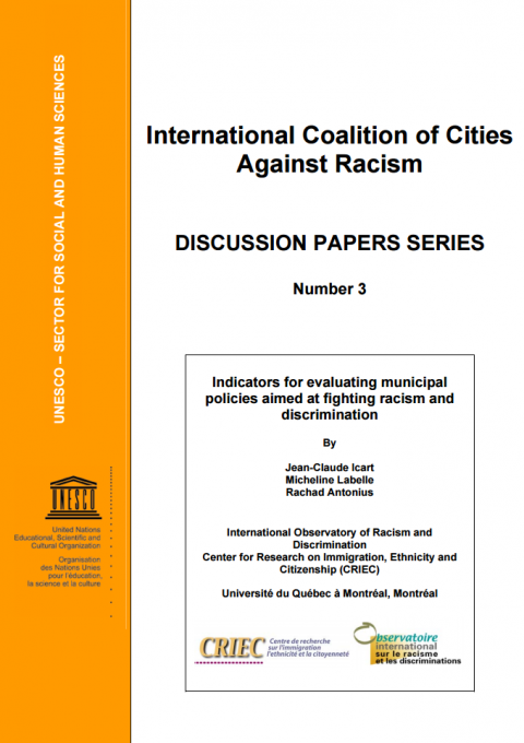 Indicators for evaluating municipal policies aimed at fighting racism and discrimination Year of publication: 2005 Author: Jean Claude Icart | Micheline Labelle | Rachad Antonius Corporate author: Centre de recherche sur l'immigration, l'ethnicité et la citoyenneté (Canada). Observatoire international sur le racisme et les discriminations Ethnocultural diversity increasingly constitutes an important characteristic of major cities around the world. As the primary centres for national, ethnic and cultural intermixing, cities are becoming laboratories for new ways of “living together” (UNESCO, 2004). However, when this diversity is accompanied by inequalities, racism and discrimination, it can increase the social divide. Therefore, in order to benefit from the true advantages of the ethnocultural diversity that makes up the fabric of contemporary societies, it has become increasingly necessary to employ methods to correct social injustices, and to ensure the equality and the full exercise of citizens’ rights. Accordingly, the last few years have seen true efforts to conceptualize interventions by cities to manage ethnocultural diversity. These efforts rely on ideologies controlled by the state and on the values of equality, social justice, and respect for pluralism that are endorsed by different international organizations such as the UN and UNESCO, or by national organizations such as human rights commissions.To promote and reinforce municipal anti-discriminatory policies, UNESCO supported the launching of the International Coalition of Cities Against Racism1. The initial framework for this Coalition was the proposal of the Ten-Point Action Plan, which was adopted in December 2004 in Nuremburg.The present research report relating to the development of a series of indicators for evaluating municipal policies to fight racism and discrimination should be situated in this context. It was carried out with the goal of assisting cities that want to adopt public policies of diversity management and to fight racism and discrimination, and to evaluate the impact of such policies. The goal is to equip cities with tools that make it possible to evaluate, in quantitative and/or qualitative terms, whether their actions produce results that correspond to the major goals of adopted policies.